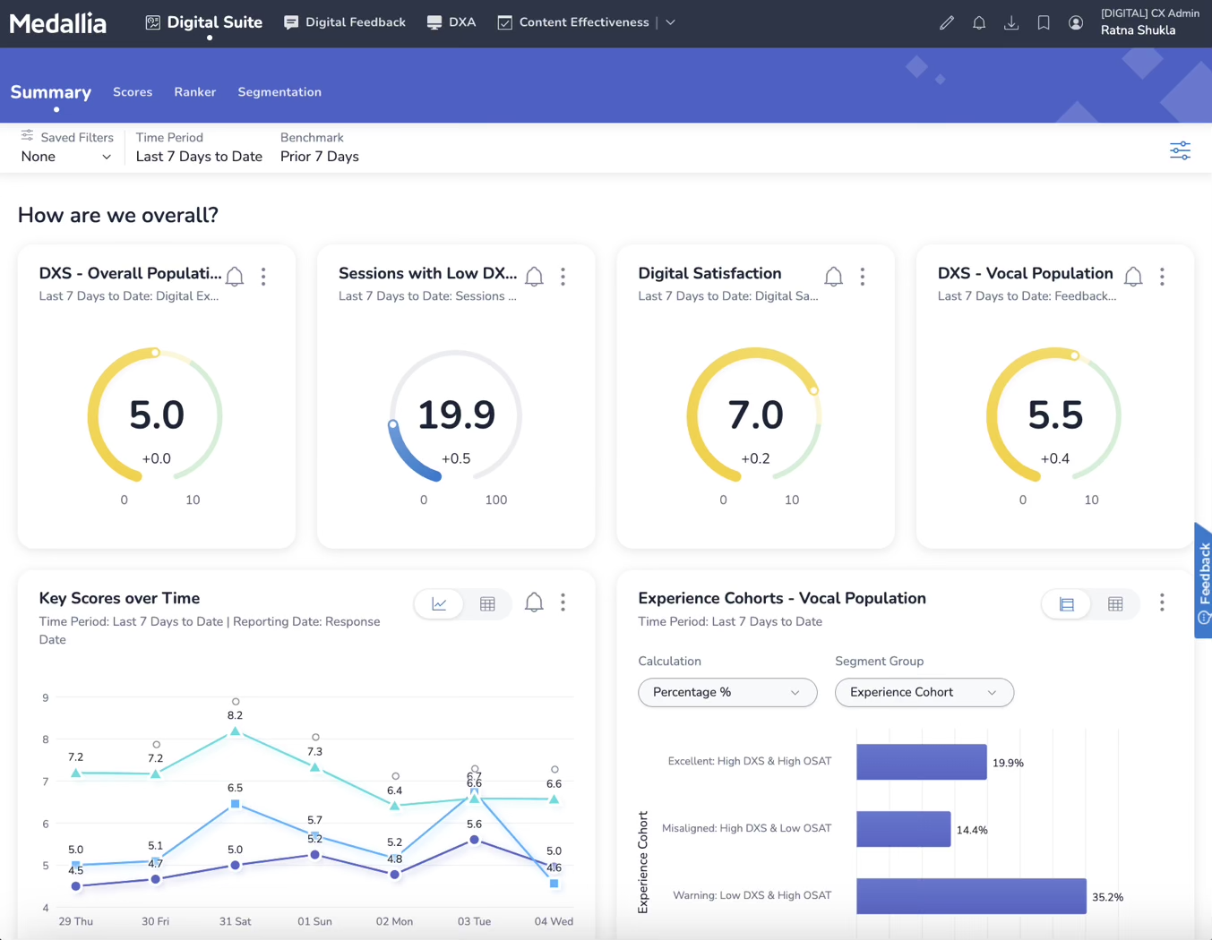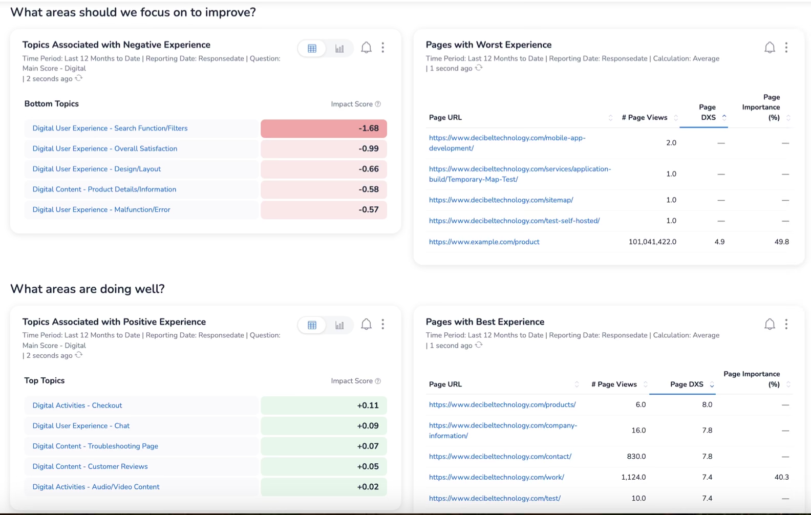 • Unique reporting and intelligence across digital feedback and digital experience analytics (DXA) programs such as: Digital summary, score, ranker, and segmentation tabs to cover key interest areas such as top/bottom performing pages, text analytics and Page DXS scores, and behaviors to uncover why customer groups exhibit both poor DXS and feedback experience scores.