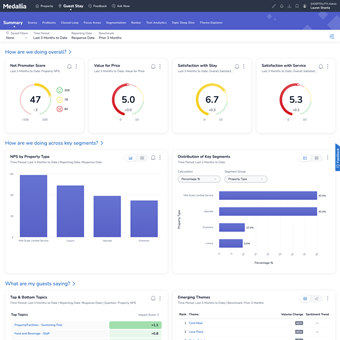 In today's hospitality industry, attracting, engaging, and retaining guests are major challenges. To win guest loyalty with responsive, top-notch experiences, hotels must listen carefully to guest voices and resolve issues as soon as they emerge. Medallia's Hospitality: Guest Stay App has everything you need to gather comprehensive feedback and convert it to actionable insights. In addition to gathering key satisfaction metrics about a guest's stay, this app has the built-in flexibility to collect feedback on nearly every aspect of their entire experience. Near infinite customization is possible using the included library of over 200+ questions, covering everything from child care to casinos, from gift shops to every nuance of a guest room. And these same questions can be used to create additional targeted surveys to gain insight on top-of-mind topics. A suite of reports offer views focused on both guest stays and feedback tied properties, allowing specific teams quick access to what matters most to them.