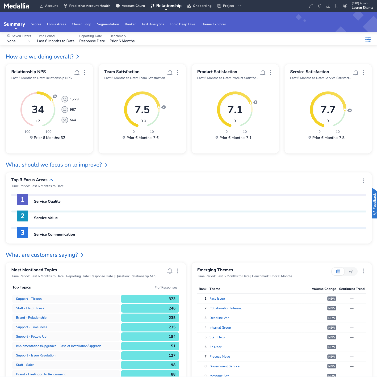 B2B client experiences are uniquely multifaceted; each client account is made up of a diverse group of stakeholders who interact with your brand across a variety of channels and touchpoints. B2B Customer Experience brings together feedback from the full range of stakeholders with key operational data and internal perspectives to provide a complete picture of each account's health. Account Managers get actionable intelligence in real time, with churn risk and upsell notifications on mobile, in Salesforce or other CRM systems, and wherever they work. Alerts and health scores draw on data ranging from customer verbatims to product usage to contract terms, turning disparate information into clear next steps.