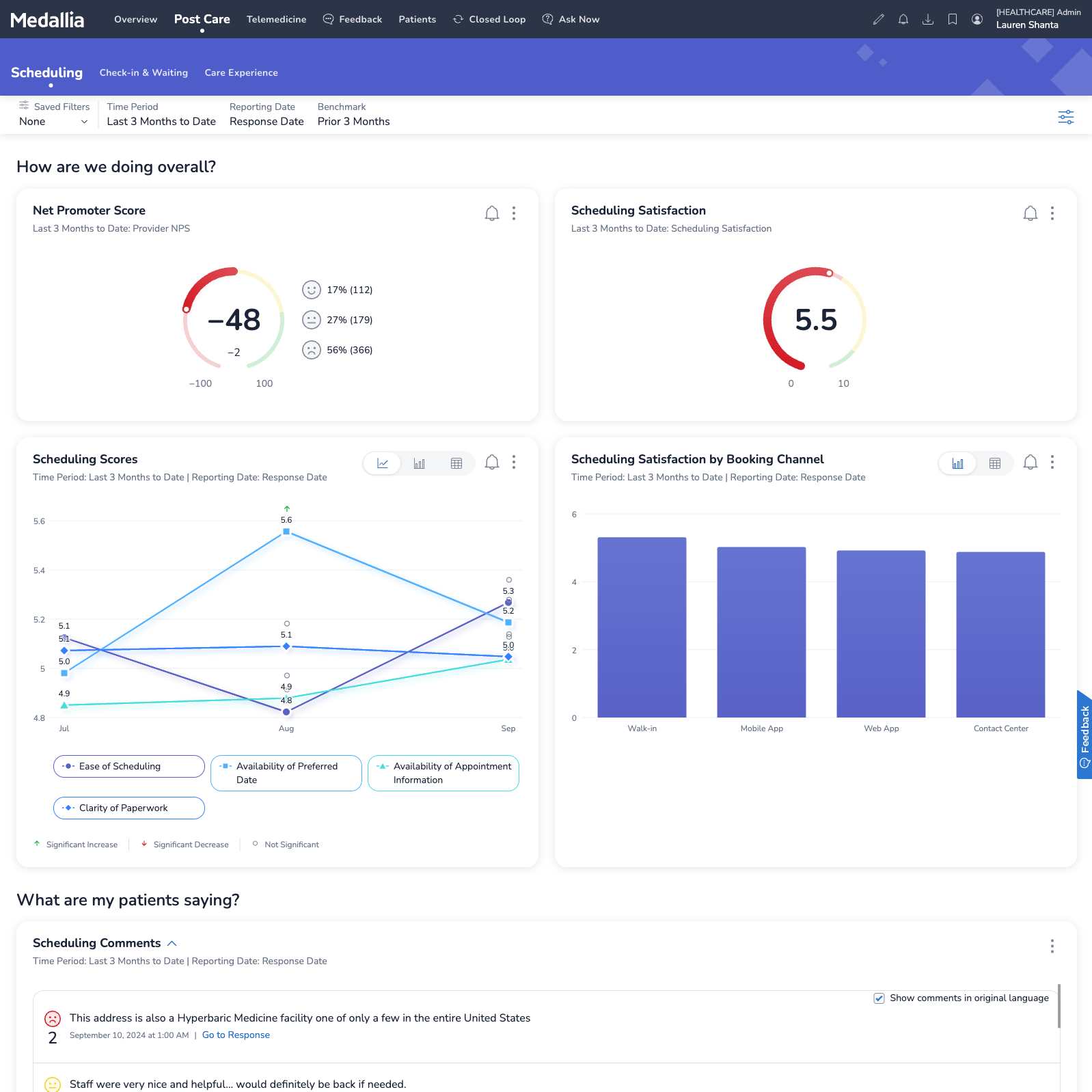 To help health systems meet their objectives, grow their business, and quickly resolve challenges to drive patient loyalty and satisfaction, Medallia leveraged learnings from successful patient experience programs to design an effective, scalable program for leaders to accelerate the delivery of better experiences and outcomes. The Healthcare: Provider - Post Care Experience app gathers feedback on key moments of the patient journey, covering everything from scheduling, wait time, the facility itself, and of course, your care teams. Reports surface insights to the appropriate teams and the appropriate times, and provide recommended actions for a better patient experience.